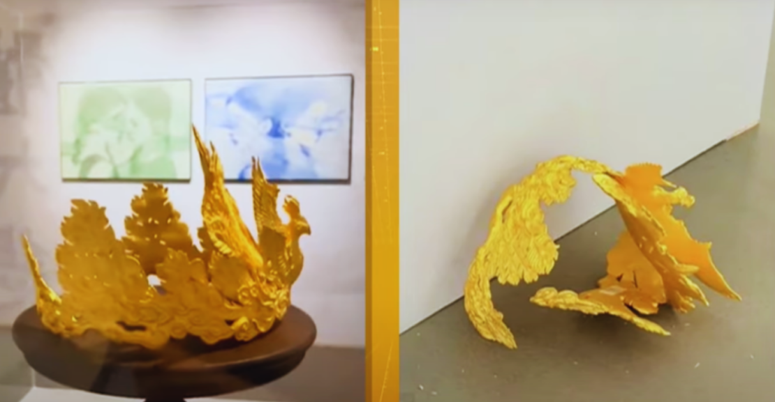 De acordo com o portal britânico Need to Know, a obra é conhecida como coroa de fênix dourada e pertence à influenciadora de beleza Zhang Kaiyi. A peça foi confeccionada em ouro puro por seu marido, o artista Zhang Yudong, e pesa cerca de dois quilos. O adorno foi usado por Zhang no dia do casamento e integrava uma mostra coletiva com obras de 87 artistas, em cartaz desde outubro, com previsão de seguir até janeiro de 2026.