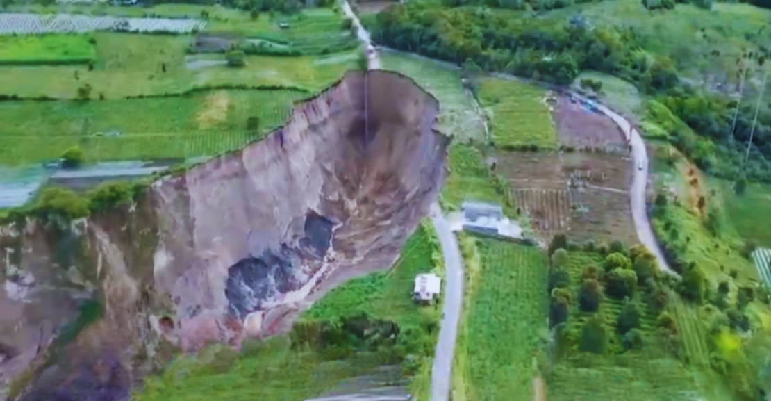 Imagens gravadas com drone neste sábado (14) mostram encostas íngremes e rachadas, atravessando as plantações no distrito de Ketol. As autoridades afirmam que o relevo continua a ceder por conta dos deslizamentos de terra e da movimentação do solo.